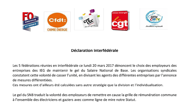 Les 5 fédérations réunies en interfédérale ce lundi 20 mars 2017 dénoncent le choix des employeurs des entreprises des IEG de maintenir le gel du Salaire National de Base. Les organisations syndicales constatent cette volonté de casser l’unité, en divisant les agents des différentes entreprises par l’annonce de mesures différentiées.